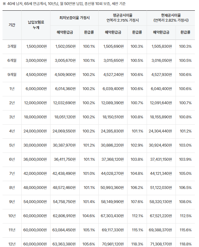 - 40세 남자, 65세 연금개시, 10년납, 월50만원 납입, 종신형 10회 보증 (세전 기준)