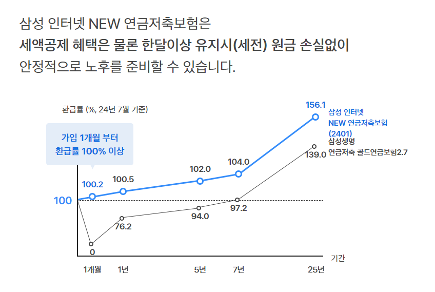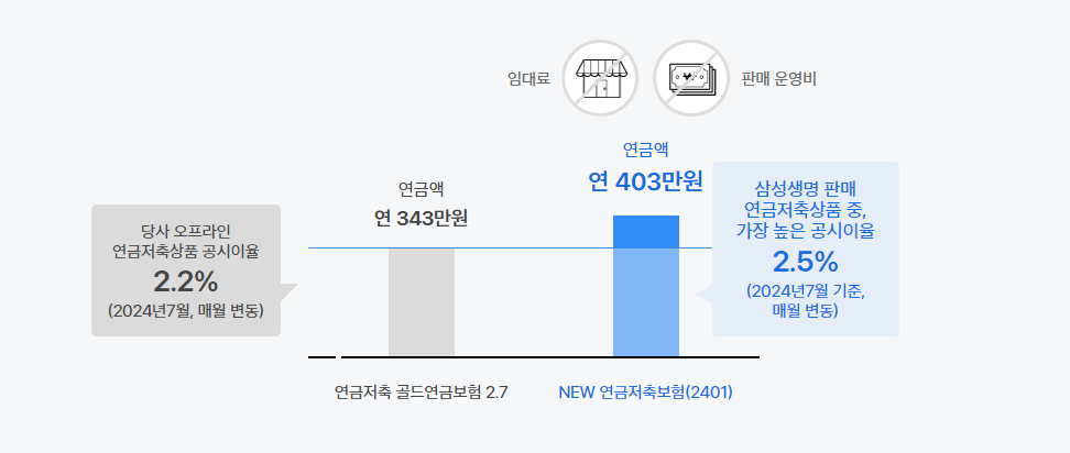 - 공시이율 NEW 연금보험 2.82%, 삼성연금보험 2.82% (24년 7월 기준, 세전) 지속가정 시, 매월 변동 가능합니다.