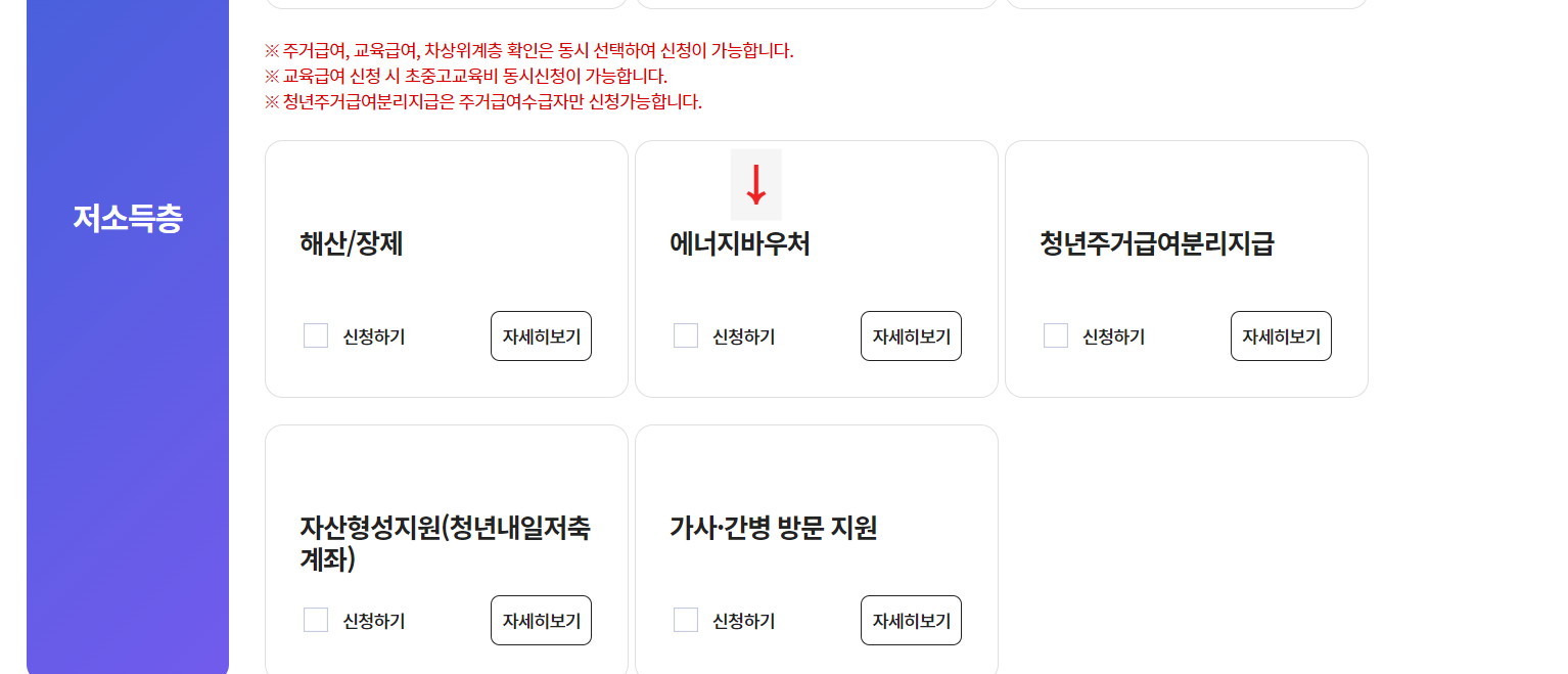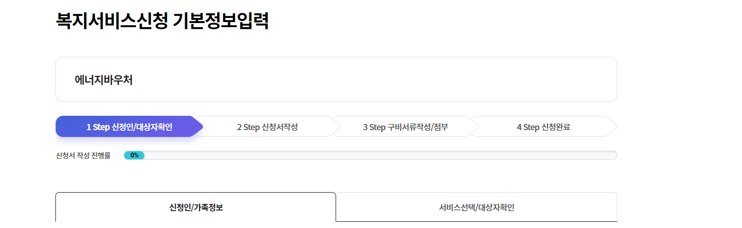 • 복지로 로그인 > 서비스신청 > 복지서비스 신청 > 복지급여 신청 > 저소득층 > 에너지바우처 > 아래 저장후 다음 >   필수란 다 동의 > 신청서 작성하시면 됩니다.