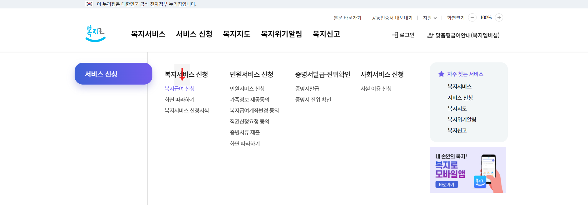 • 복지로 온라인신청 방법은 다음과 같습니다.