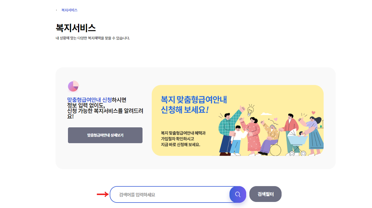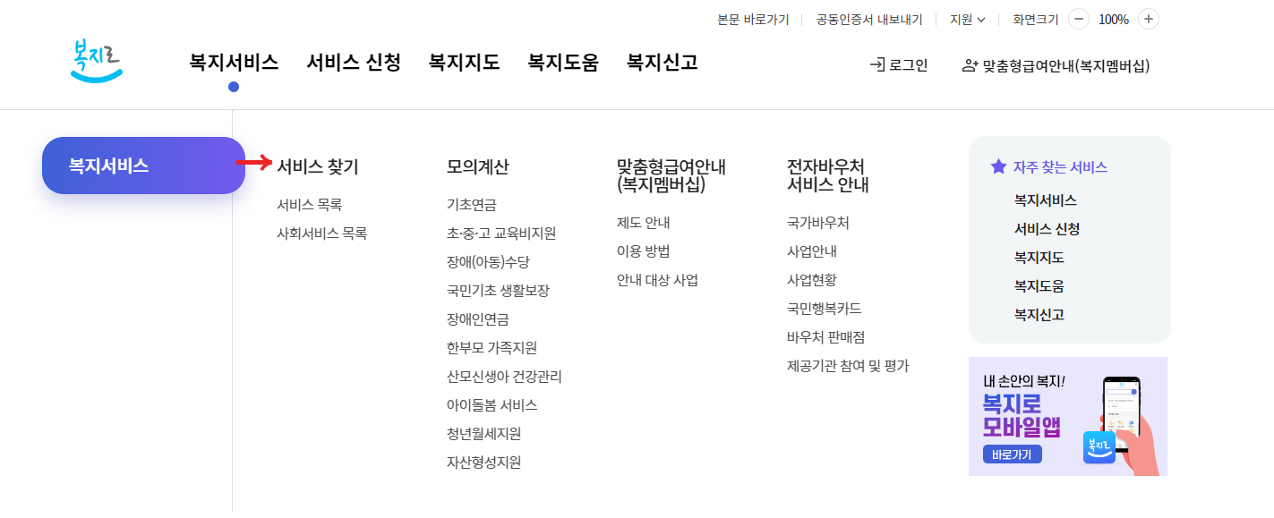 - 복지로 홈페이지에서 복지서비스 및 서비스 찾기 눌러줍니다.