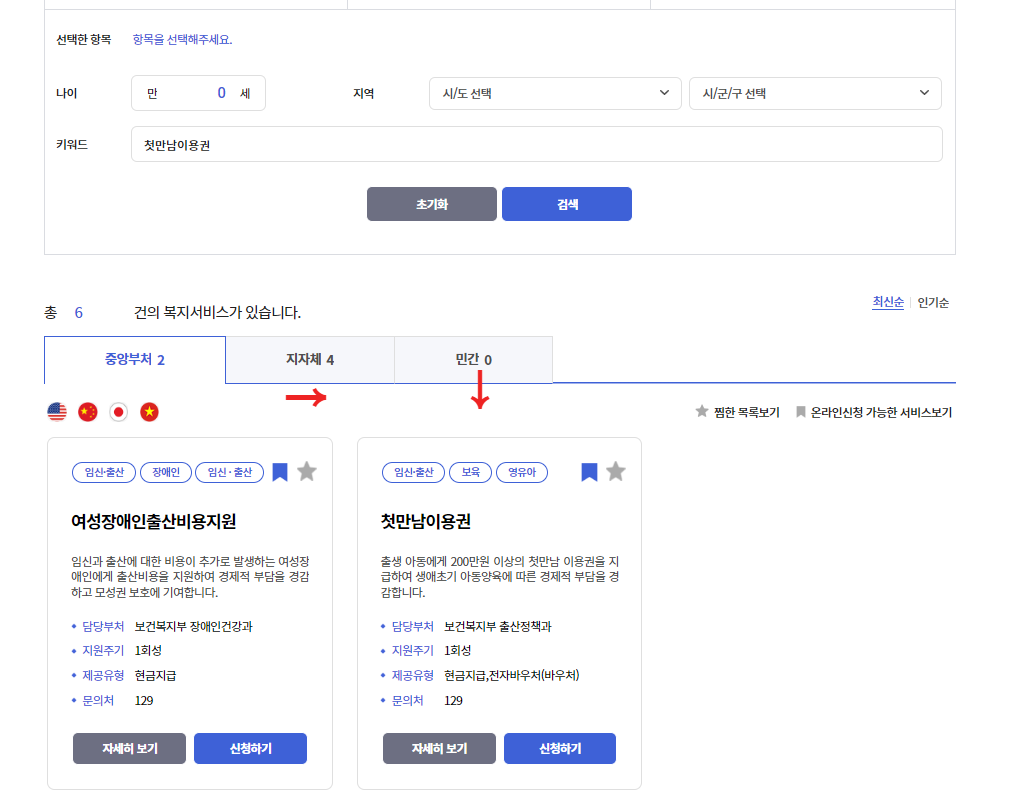 - 중앙부터에 2가지의 복지서비스가 나오는데 아래에 나와있는 첫만남이용권 신청하기를 눌러줍니다.