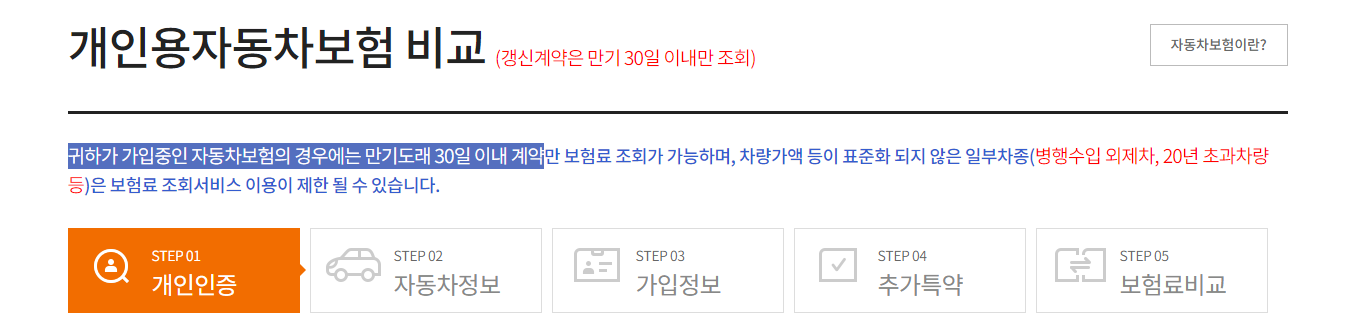 - 개인용 자동차보험 비교를 위해선 개인인증, 자동차정보, 가입정보, 추가특약 정보를 입력한 후, 보험료 비교를 할 수 있습니다.