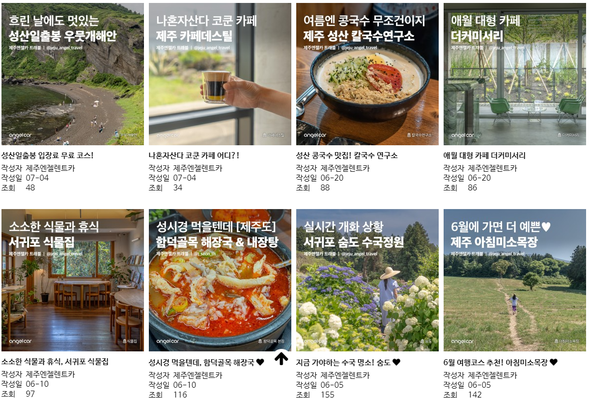 제주도 여행을 계획하고 계신다면, 제주엔젤렌트카를 이용해보는 것도 나쁘지 않을 것 같습니다 다양한 차종, 합리적인 가격, 완전자차 무료혜택, 간편한 예약 및 차량 인수, 친절한 고객 서비스 등 제주엔젤렌트카는 고객들에게 좋은 렌터카 경험을 제공할 것입니다. 그리고 가까운 시일내에 제주엔젤카를 이용하면 할인 쿠폰 지급으로 인해 저렴하게 렌트를 할 수 있고, 다양한 맛집과 카페 할인 이벤트도 하고 있어 제주엔젤카를 이용하실 예정이라면 꼭 이벤트를 확인하여 할인을 받으며 경제적인 여행되시길 바랍니다.