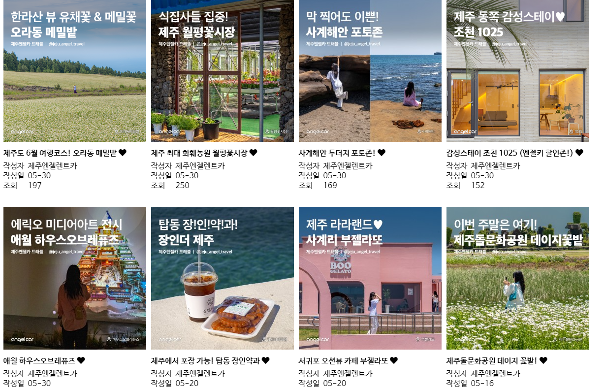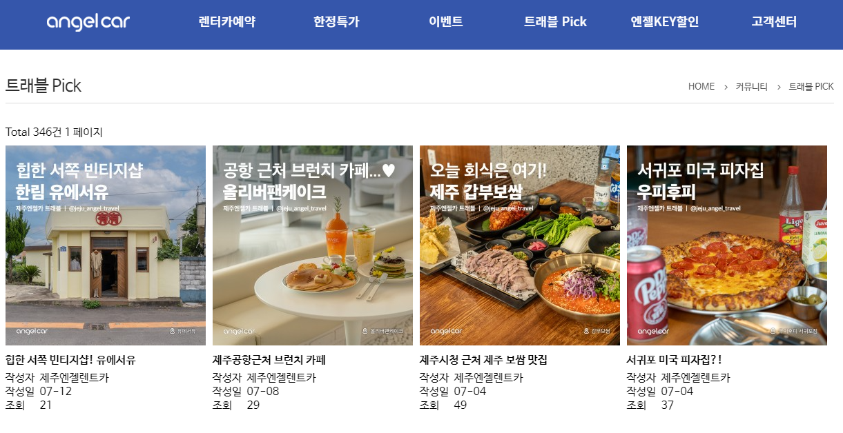 제주엔젤렌트카는 24시간 운영되는 고객센터를 통해 고객들의 모든 문의사항에 신속하게 답변을 해줍니다. 제주도 여행에 필요한 다양한 정보를 제공하며, 최적의 여행코스를 추천해줍니다. 공식홈페이지에 트래블PICK이라는 카테고리를 누르면 다양한 맛집 및 관광지들을 소개해줍니다. 트래블 PICK 옆 엔젤KEY 할인을 가도 다양한 맛집, 카페, 관광지 및 숙소, 체험&소품샵에서 할인을 받을 수 있습니다.