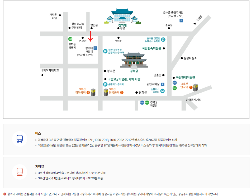 • 청와대 내에는 관람객용 주차 시설이 없으니, 가급적 대중교통을 이용하시길 권장드립니다.