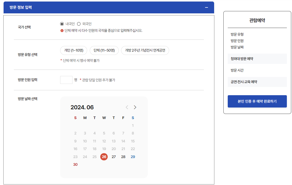 - 국가, 방문유형, 방문인원, 날짜를 선택을 합니다.