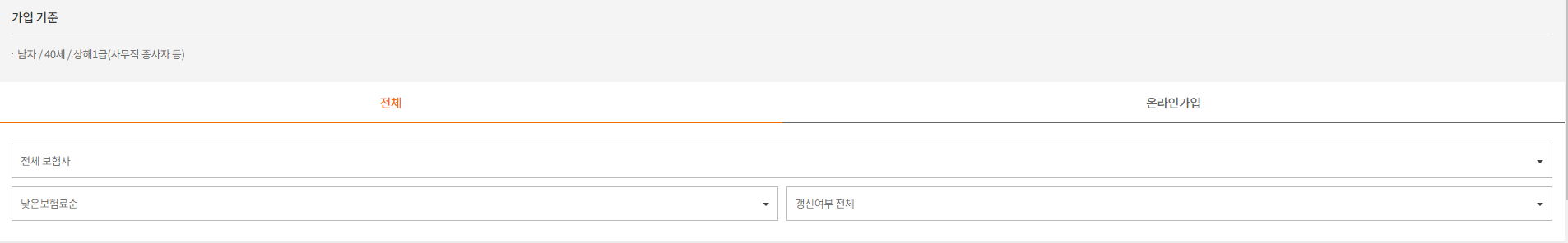 - 가입기준 : 남자 / 40세 / 상해1급(사무직 종사자 등)