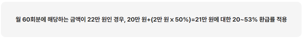 - 월 대중교통 이용금액 20만원 초과 시 초과 이용금액에 대해서는 50%만 적용하여 지급합니다.