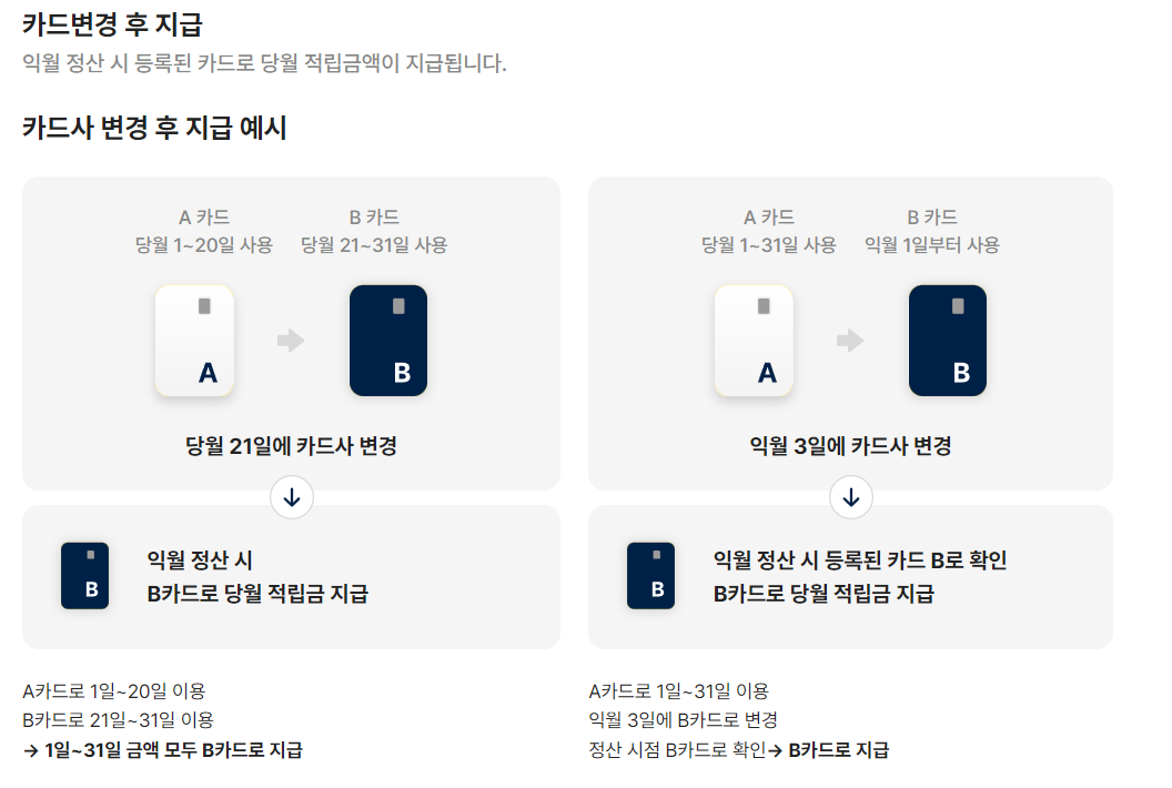 - 지급일 : 적립 월의 익월 5영업일에 이용 중인 카드사로 최종 지급 급액을 보내드립니다.